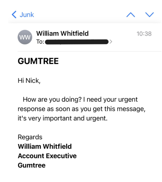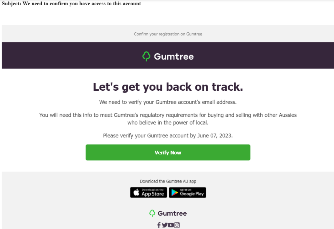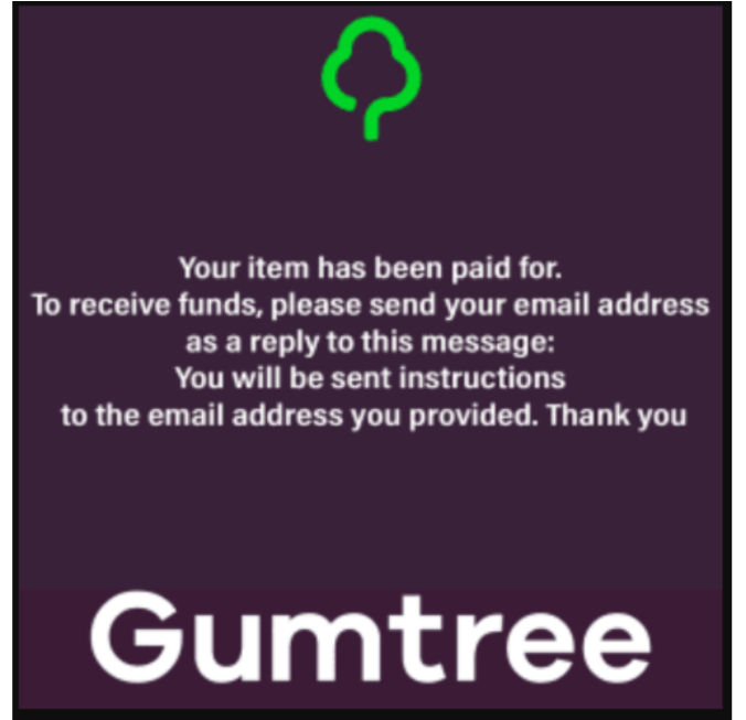 - An email from "Gumtree" claiming you have a new message from a buyer for an ad you didn't post. Please do not reply to the message and instead Contact Us to report suspicious activity.