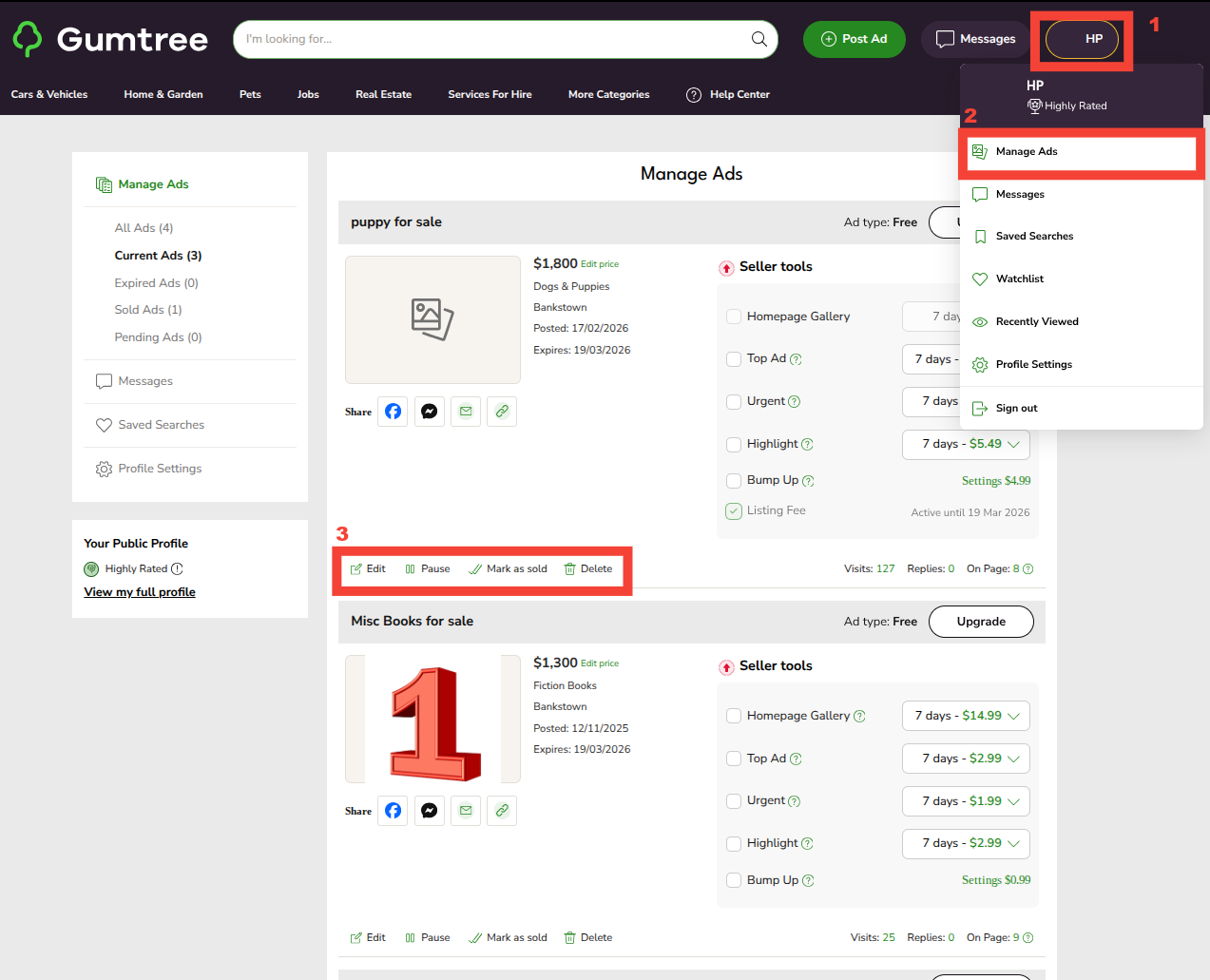 - Sign in and click on your name displayed at the top of every Gumtree page.